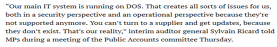 It equally angering when you discover Canada’s auditor general currently has to operate on a DOS operating system, which was deemed obsolete in the mid 1990’s. This is not only a security risk, but a downright assault on the accountability of Canada’s politicians and their financial decisions.