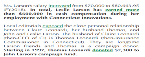 This is just one example of a conflict of interest. Now let us look at Mr. Larson’s wife who was hired in lieu of 198 other candidates for an administrative position at Connecticut Innovations.