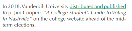 Now let’s move on to another politician, U.S representative Jim Cooper (D). Mr. Cooper’s number one campaign donor is Vanderbilt University. Vanderbilt University even distributed and published Rep. Jim Cooper’s “A College Students Guide To Voting In Nashville” on the college website ahead of his midterm elections.