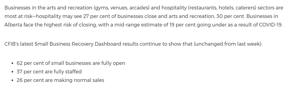 COVID policies have decimated small businesses with 27 to 30 per cent of hospitality businesses expected to close permanently. As of a month ago, only 62 percent of small businesses were open, and only 26 percent were making normal sales. It’s important to consider this when we claim COVID policies are “saving lives,” because when unemployment goes up it is accompanied with an increase in suicides, overdoses and even homicides.