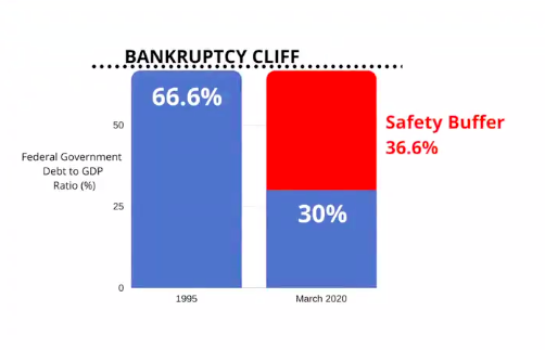 In March this year we had a 30 per cent debt to GDP ratio — with a safety buffer of 36.6 per cent before things were to get grim or “where we can expect to go bankrupt,” as Poilievre puts it.