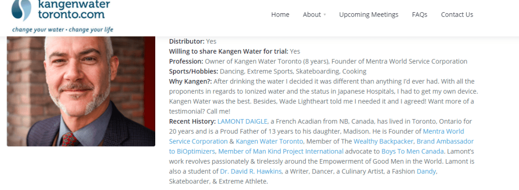 Mr. Daigle let it be known through prior communications together that he has a company called Kangen Water Toronto. It is here on their page where Lamont again indicates his support for the ManKind Project.