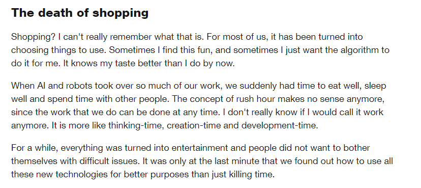 “Shopping? I can’t really remember what that is. For most of us, it has been turned into choosing things to use. Sometimes I find this fun, and sometimes I just want the algorithm to do it for me. It knows my taste better than I do by now.”