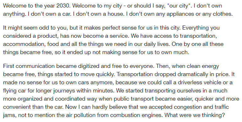 The article, which is published on the World Economic Forum website was titled “Welcome to 2030. I own nothing, have no privacy, and life has never been better.” The article describes a dystopian nightmare where no one holds any property rights, owns any property (car, dishware, appliances, clothes), and no one has a home they can call their own. Don’t believe me? Let’s get to the quotes shall we?