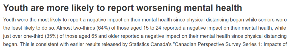 Stats Canada – has reported that 64% of those aged 15-24 have reported a negative impact on their mental health during COVID. All ages have felt the impact though, with 35% of those over the age of 65 also reporting negative impacts to their mental health. 46,000 people were surveyed between April 24th and May 11th. The survey tells the reader to interpret the results with caution.