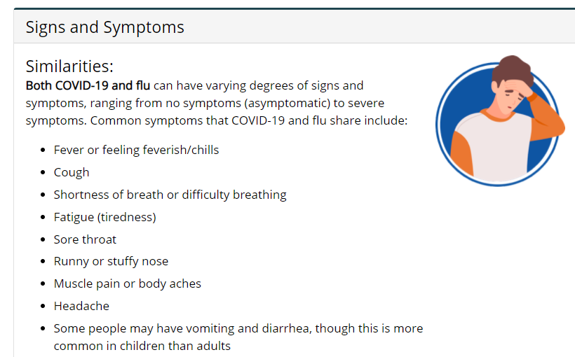 Insert the Covid policies stopped the flu argument. Let’s break it down a little further. The following is a list from the CDC website that lists the common symptoms shared between the Flu and Covid.