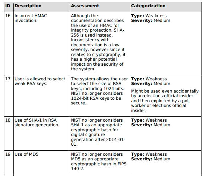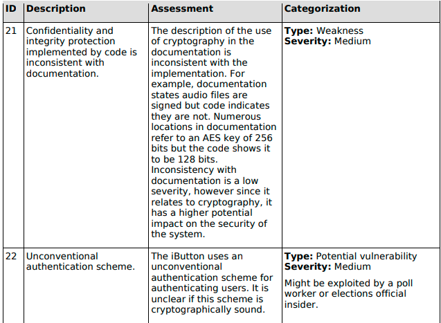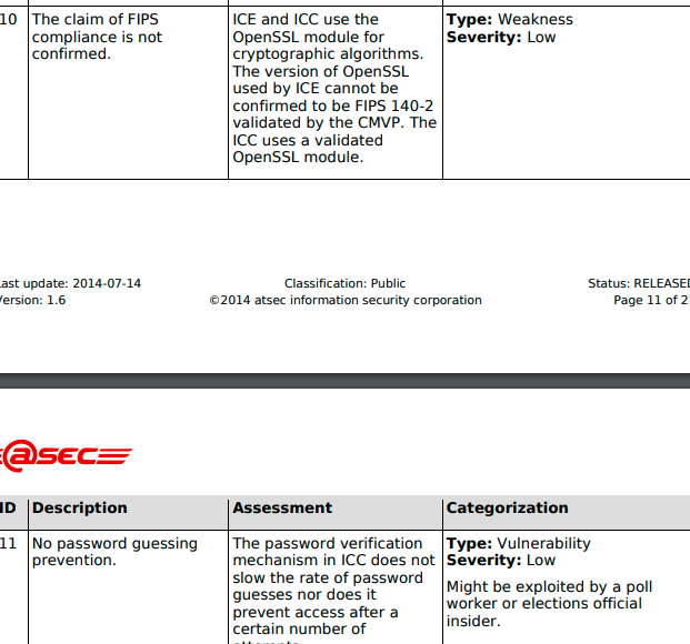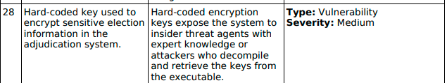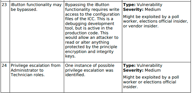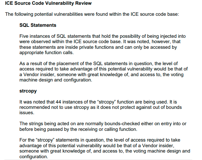 “Five instances of SQL statements that hold the possibility of being injected into were observed within the ICE source code base. It was noted, however, that these statements are inside private functions and can only be accessed by appropriate function calls. As a result of the placement of the SQL statements in question, the level of access required to take advantage of this potential vulnerability would be that of a Vendor insider, someone with great knowledge of, and access to, the voting machine design and configuration.”