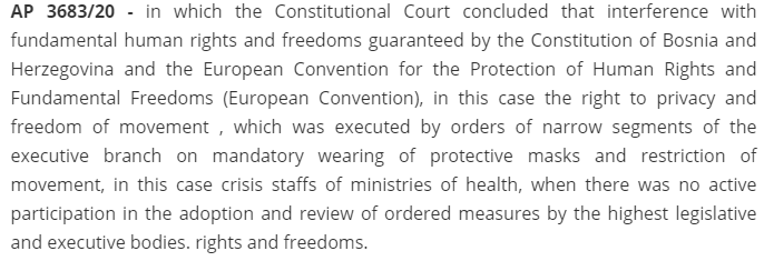 The court concluded that “interference with fundamental human rights and freedoms guaranteed by the Constitution of Bosnia and Herzegovina and the European Convention for the Protection of Human Rights and Fundamental Freedoms (European Convention) had happened. Specifically, in regards to “the right to privacy and freedom of movement, which was executed by orders of narrow segments of the executive branch on mandatory wearing of protective masks and restriction of movement.“