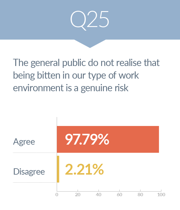 An interesting finding while looking through the survey results indicates that many in careers involving these risks don’t think the general public even realize that being bitten is a genuine risk with nearly 98 per cent agreeing with that statement.