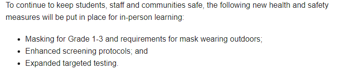 Perhaps the most appalling of the changes (in my opinion) is the requirement for students attending in-person learning to wear a mask while outdoors. This is being required by students even though it is only recommended for the general public when physical distancing isn’t possible.