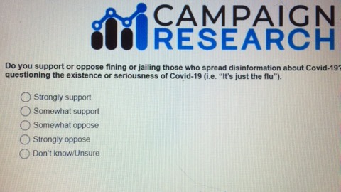 - “Do you support or oppose fining or jailing those that spread misinformation about COVID-19 (Cuts off) questioning the existence or seriousness of COVID-19 (i.e. “it’s just the flu”)?