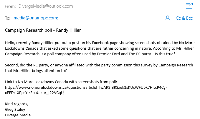 Randy Hillier, independent MPP for Lanark-Frontenac-Kingston has posted some concerning screenshots from a “recipient of one of their polls,” those polls being from Campaign Research and has shared them with No More Lockdowns Canada. Some of the screenshots are cut off and can’t be read entirely. It is also unclear at this point who commissioned the survey.