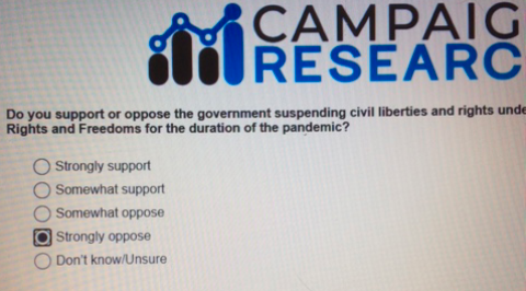 - “Do you support or oppose the government suspending civil liberties and rights under (cuts off, begins again on next line) rights and freedoms for the duration of the pandemic?”