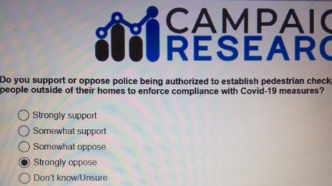 - Do you support or oppose police being authorized to established vehicle checkpoints to question drivers and occupants to enforce compliance with COVID-19 measures? This is downright terrifying. Do I support a police state? No, I’ll pass on that thanks Compliance Research, sorry I meant to say Campaign Research.