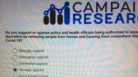 Here is the question that was asked (some cut-off in the screenshot) – “Do you support or oppose police and health officials being authorized to sepa (cuts off) discretion by removing people from homes and housing them somewhere else (cuts off) COVID-19?”