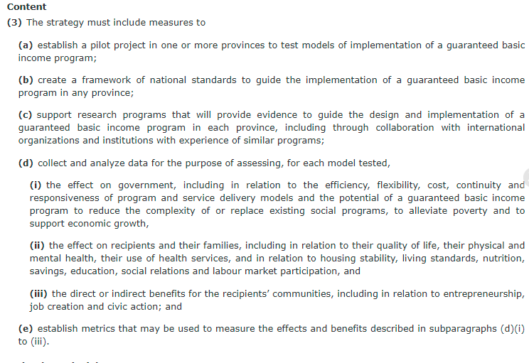 The Bill proposes that the strategy must include a pilot project in one or more provinces to test various models for the implementation of a guaranteed basic income.