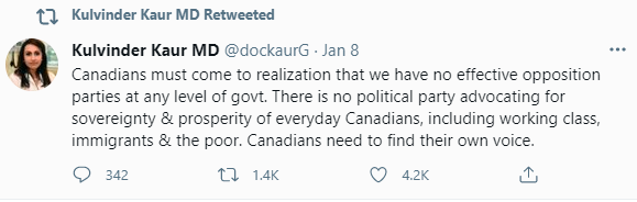 Perhaps its tweets like the one below that have garners the ire of politicians within the Conservative party. Dr. Kaur says there is “no political party advocating for sovereignty and prosperity of everyday Canadians.”