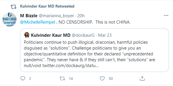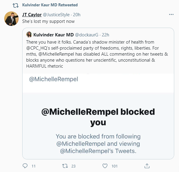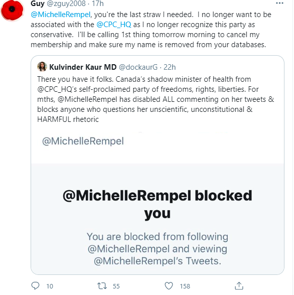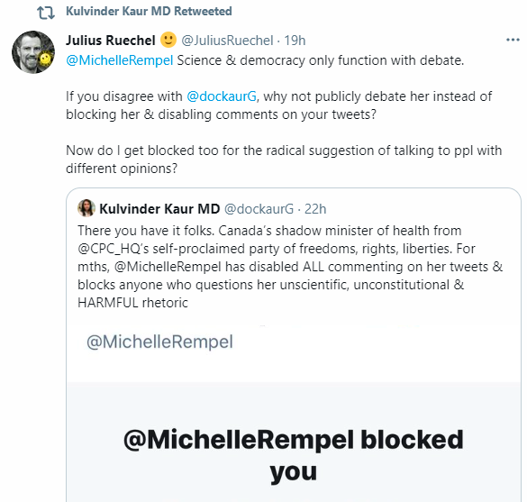 “There you have it folks. Canada’s shadow minister of health from @CPC_HQ’s self-proclaimed party of freedoms, rights, liberties. For mths, @MichelleRempel has disabled ALL commenting on her tweets & blocks anyone who questions her unscientific, unconstitutional & HARMFUL rhetoric.”