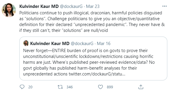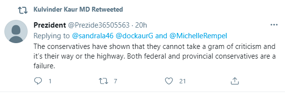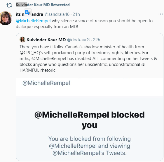 Dr. Kulvinder Kaur has been outspoken for quite some time on the COVID-19 narrative, with a CBC article on some of her tweets dating back to August 10th of 2020. Yes, you can’t be outspoken in today’s era without a social media mob following you – especially as a physician with an unpopular opinion on Covid. Dr. Kaur appeared to be quite unimpressed with the shadow minister of health’s decision to block her on Twitter.