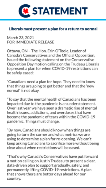 After sticking the finger up into the political winds and discovering that many Canadians don’t like lockdowns – the Conservatives decided to table a motion for the Liberals to detail a plan for a return to normal within 20 days. Sounds great, doesn’t it? Better late than never I suppose.