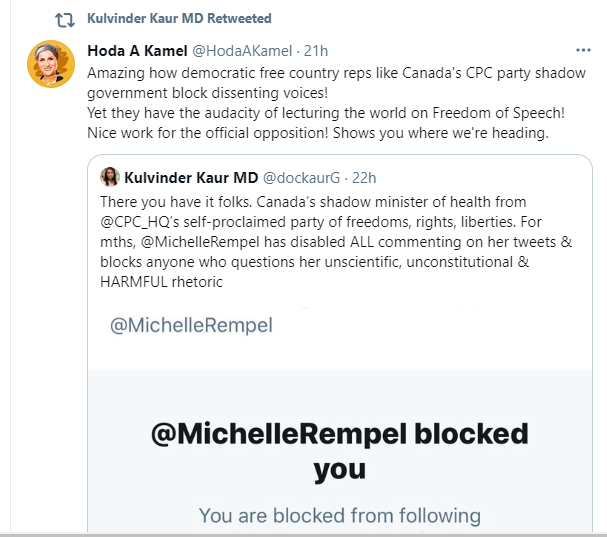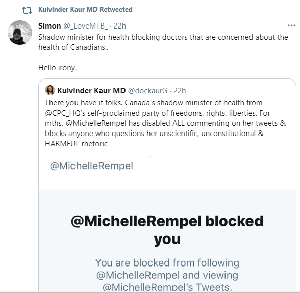 Twitter erupts – Dr. Kaur shares tweet after tweet of disapproval of Rempel’s decision to block her
