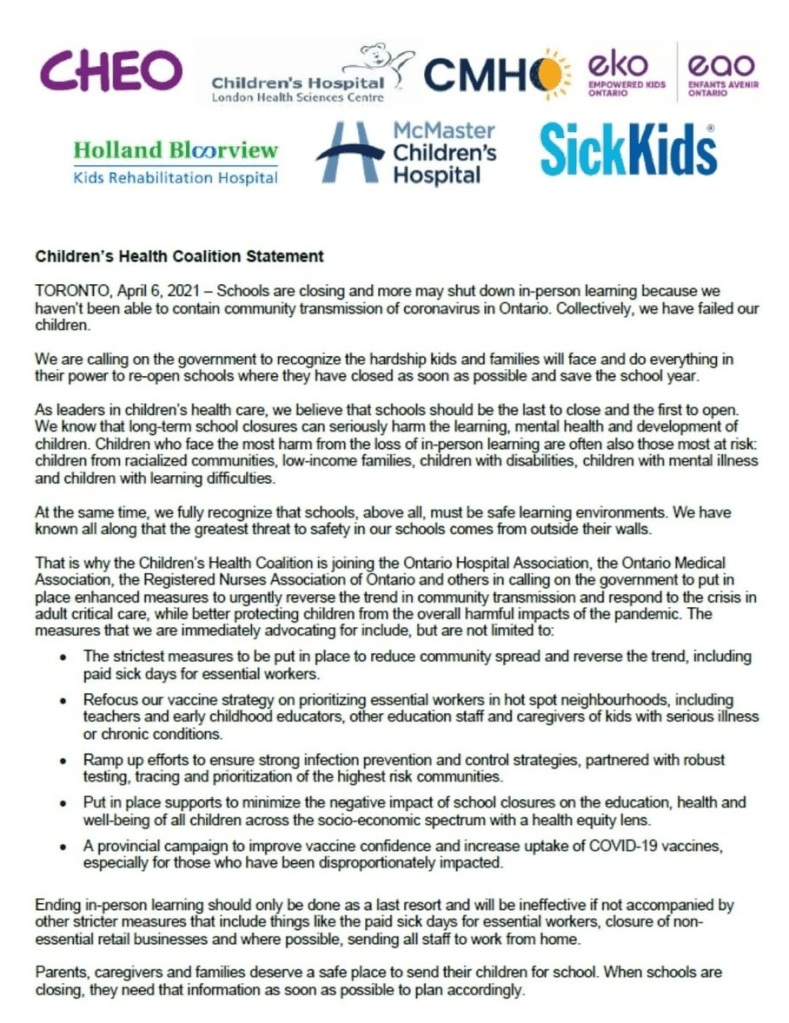 While this lock-down has numerous targets, in the past few days the target has been the school system with numerous schools throughout Ontario closing the doors and returning to remote online learning. Online learning has 80% of kids failing two or more classes. In response, various higher-ups involved with Sick Kids, including Dr. Ronal Cohn the President and CEO of The Hospital For Sick Kids have sent a letter stating that the schools need to stay open, which has been a massive talking point these past few days and will no doubt continue to be one.