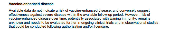 In the Pfizer application to the FDA for their COVID-19 vaccine to receive approval, they addressed the history surrounding “vaccine-enhanced disease” also called “Antibody-dependent Enhancement“. Pfizer’s FDA application says that “available data do not indicate a risk of vaccine-enhanced disease, and conversely suggest effectiveness against severe disease within the available follow-up period. They do note that the “risk of vaccine-enhanced disease over time, potentially associated with waning immunity, remains unknown and needs to be evaluated further in ongoing clinical trials and observational studies.”