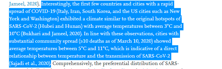 “Between the time when COVID-19 transitioned from being an epidemic to being declared a real pandemic of global significance, regions with higher temperatures (>20°C) still reported lower numbers of COVID-19 cases than those with lower temperatures. Notably, 90% of SARS-CoV-2 transmission occurred within temperatures ranging between 3°C and 17°C in February and March 2020” – “Is coronavirus disease (COVID-19) seasonal? A critical analysis of empirical and epidemiological studies at global and local scales”