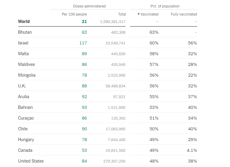 The Premier hinged step one of reopening the province on achieving a vaccination target of 60%. This means that to begin receiving back scraps of freedom and the ability to live your life and operate your businesses – 60% of Ontarians must vaccinate themselves with an interim approved vaccine that has no long-term studies on it. Even if 60% of Ontarians are willing to vaccinate the question is how long would it take to achieve this target? To answer that question we must look at the world’s leading nations in COVID-19 vaccination rates.