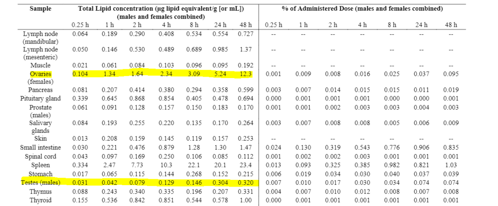 *See chart below from bio-distribution report showing high concentrations in ovaries and testes. This is where the concern of infertility comes from.*