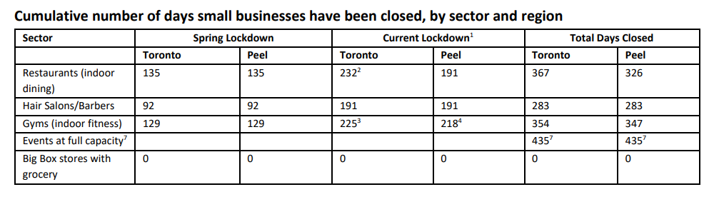 The CFIB put together data by sector and regions, Toronto and Peel, to show how many days businesses have been closed accumulatively between the prior spring lockdown and the current lockdown.