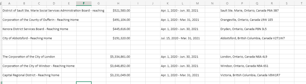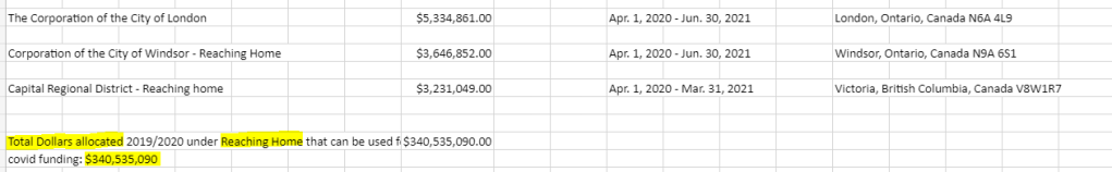 My calculations showed that over 340 million dollars has been committed to these cities and municipalities in the name of Reaching Home funding. The majority of this funding is set to end on one of two dates – either June 30th, 2021 or March 31st, 2021. There is one exception to the rule and that is the city of Toronto who was the first to receive funding under the Reaching Home name. Toronto has one agreement that’s in place from April 1st, 2019 – March 31st, 2024 and it’s worth over 127 million dollars.