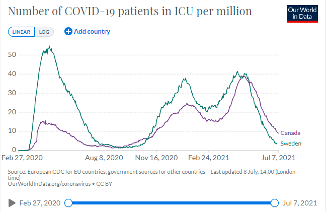 Based on the latest data, Sweden is currently experiencing fewer hospitalizations per million people than Canada, Italy, the United Kingdom and even the United States which now many parts of are completely Covid restriction free.