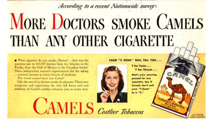 The tobacco industry was confronted with compelling peer-reviewed scientific evidence of the harms of smoking beginning in the 1950s but the industry’s use of “sophisticated public relations approaches to undermine and distort the emerging science” was very effective in delaying the link between tobacco use and lung cancer from becoming public knowledge. One of these public relations approaches was to have physicians advertise their favourite brand of cigarette.