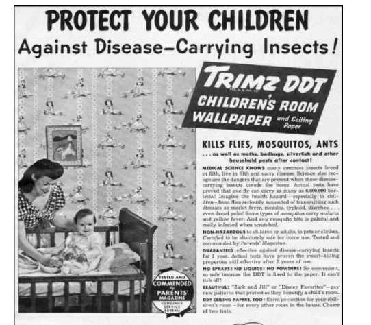 “No flies on me – thanks to DDT.” This was a popular slogan that promoted the insecticide. Back when DDT was commonly used in the United States as an insecticide, trucks used to drive through neighbourhoods dousing the kids in clouds of DDT. Parents would even encourage their children to go out and play in the clouds of the insecticide! One government advertisement from the U.S from 1947 even shows one man eating some food that had just been sprayed with DDT to show that it was so safe you could even eat it!