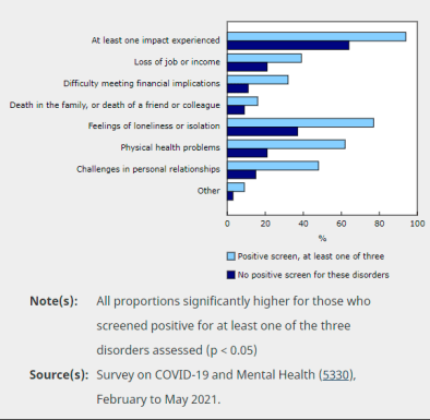 There has been a great deal of concern that the pandemic is having profound impacts on the mental health of Canadians. Specifically, in those who have experienced social isolation, job loss and other negative impacts. It should be noted that some of these impacts are the direct result of government policies aimed at metrics like lowering COVID-19 cases and hospitalizations within the country. COVID lockdowns and restrictions as an example have had an immense impact on businesses and the livelihood of those businesses and the Canadians they employ.