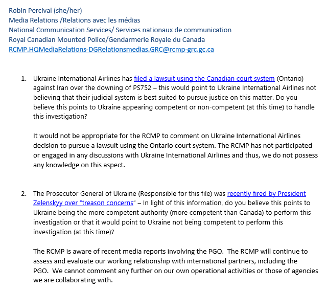 In fact, in communications with Diverge Media, RCMP media relations said that they “continue to have confidence” in the efforts of Ukraine despite the war and other issues (see images below) that would make a proper investigation possible.