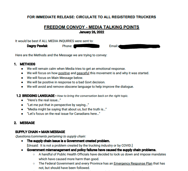 Benjamin Dichter, The Freedom Convoy Corps Public Relations lead shared an email with Diverge Media from former Conservative MP Russ Hiebert that showed the Conservative MP laying out talk points for the Convoy in a PDF document. Mr. Dichter said that he “didn’t pay attention to their email because it’s from the Conservative Party” and added that he didn’t “really care what they think to be entirely honest.”