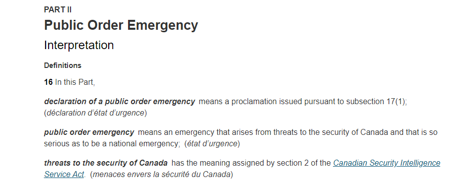 The Emergencies Act says that a “public order emergency means an emergency that arises from threats to the security of Canada” and then makes reference to those threats being defined by section 2 of the Canadian Security Intelligence Service Act – see below.