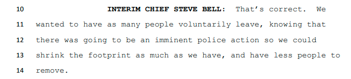 Deputy Chief Bell also testified that he “wanted to have as many people voluntarily leave” as possible so that they could “shrink the footprint” and have “less people to remove” – something the deal to consolidate trucks onto Wellington seems to coincide well with.