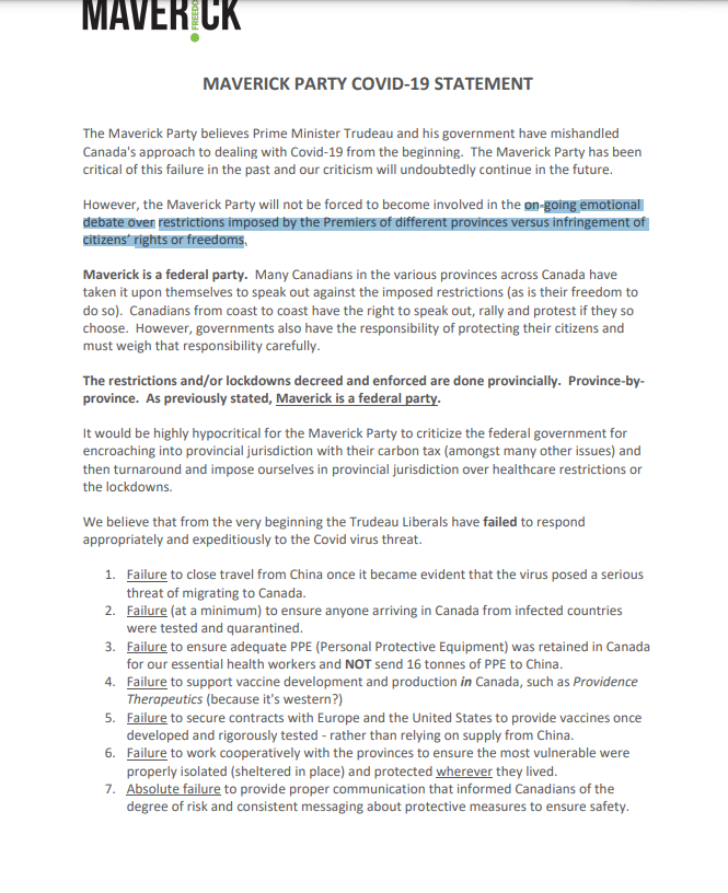 Another gem from the Maverick Party’s Covid statement was that Canadians have “the right to speak out” but “governments also have the responsibility of protecting their citizens.”