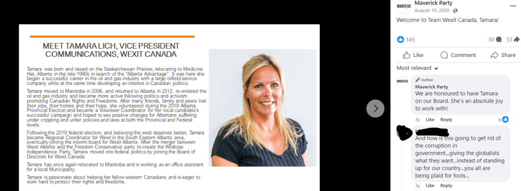 The Maverick party, whom Tamara Lich was the VP of Communications for said they “will not be forced to become involved in the on-going emotional debate over restrictions imposed by the Premiers” versus the “infringement of citizens rights or freedoms.”