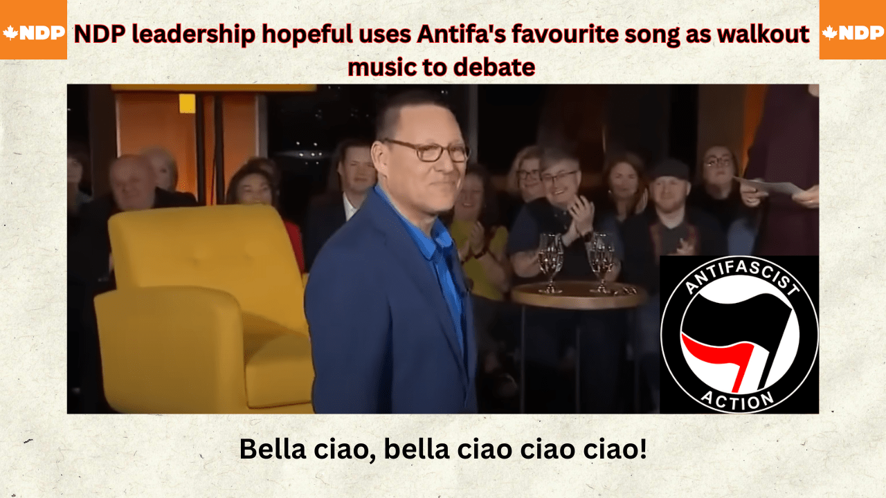 Opinion article by Greg Staley Written on: 2025-11-24 After the assassination of Charlie Kirk, investigators discovered an unfired bullet with the inscription “O bella ciao, bella Ciao, ciao ciao.” This phrase, taken from an Italian folk song, is historically linked to communist movements and is now also used by various Antifa groups worldwide. So whyContinue reading “NDP leadership hopeful uses Antifa’s favourite song as walkout music to debate”