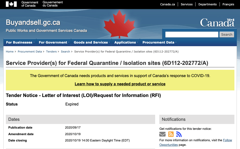 “The Government of Canada is considering engaging a third party service provider for federal quarantine/isolation sites that will be used to house and care for people for public health and other related federal requirements associated with the COVID-19 pandemic response.”